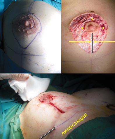 - круговая мастопексия (*подтягивание* или реконструкция правой (здоровой молочной железы) до формы новой левой (где ранее располагалась опухоль)