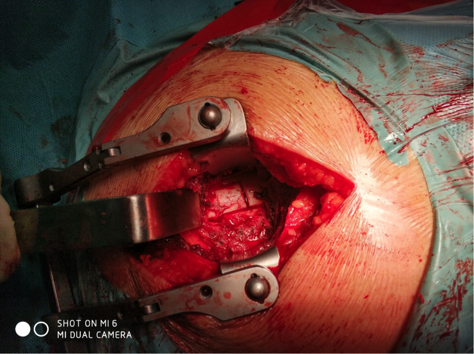 После осуществления доступа к опухоли кости выполнено формирование *костного окна*