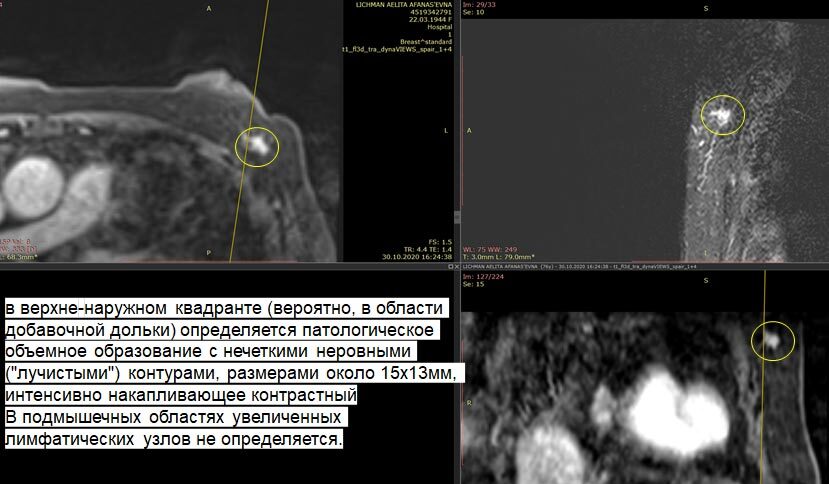 Как всегда пациентка самостоятельно обнаружила опухоль в левой подмышечной области. Незамедлительно обратилась ко мне. Самым современным способом диагностики РМЖ является МРТ молочных желез с контрастным усилением и качественно выполненная кор (столбик)-биопсия опухоли. Остальные методы диагностики (УЗИ и маммография или цитологическая пункция) обладают меньшей чувствительностью к правильной установке точного диагноза.