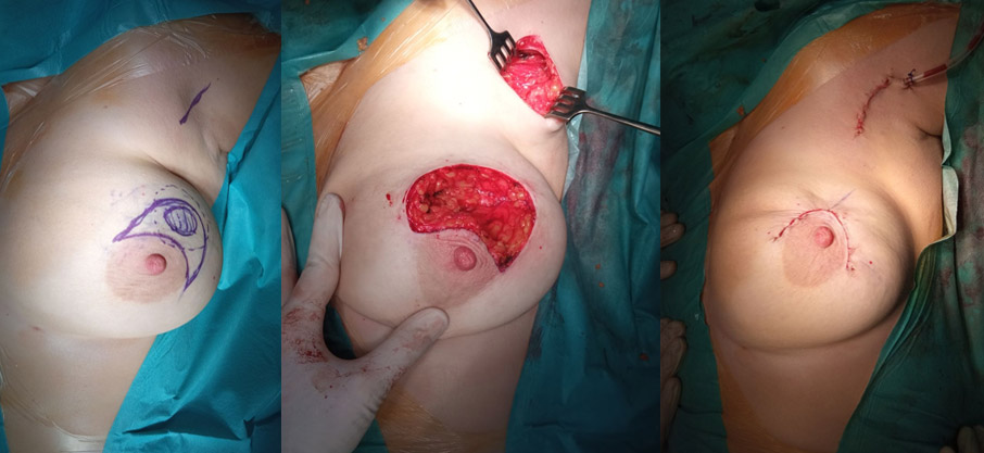 - Секторальная резекция резекция левой молочной железы через параареолярный доступ.
