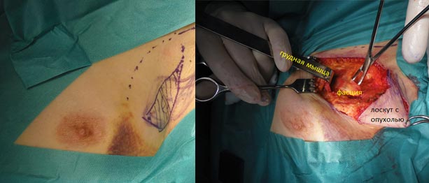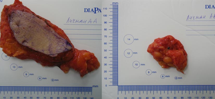 Уже через 7 дней после обращения она была прооперирована. Расположение опухоли позволило мне сохранить ей железу (грудь) без риска рецидива. Ей была выполнена радикальная резекция молочной железы с удалением поверхностных лимфоузлов. Данная техника операции не приводит к отеку руки. Опухоль направлена на гистологическое исследование и если прежний (благоприятный) диагноз подтвердится, то в последующем она будет получать только таблетированную гормонотерапию (без химиотерапии), что очень важно в ее возрасте (76 лет).