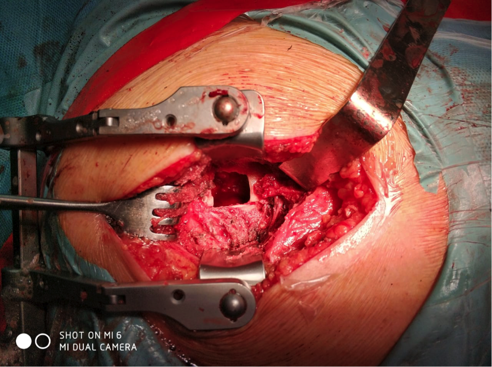 После осуществления доступа к опухоли кости выполнено формирование *костного окна*