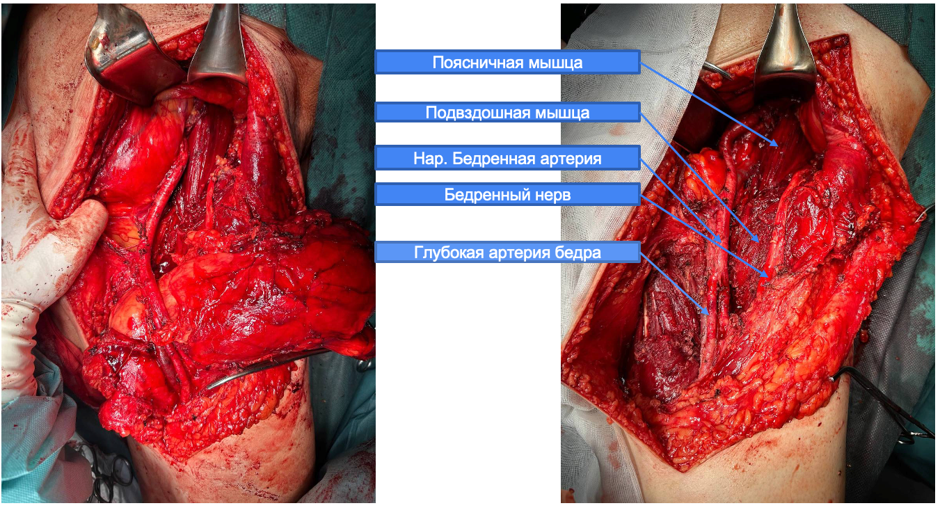 ●Мобилизация опухоли в забрюшинном пространстве с частичной резекцией поясничной и подвздошной мышцы
